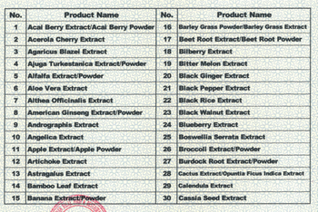 المنتجات الرئيسيةخلاصة جذور البيونيا ألبيفلورا ، خلاصة سينتيلا اسياتيكا ، غلابريدين ، حمض أورسوليك